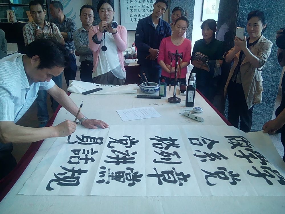 書法秀精彩紛呈,高潮迭起。剛開始大家還刻意謙讓,后來簡直成了競技上場,大家爭先恐后,唯恐寫不上,沉浸在忘我的狀態中,書者和觀者都忘了時間,連下班的號聲都沒聽見。最后,在工作人員的一再提醒下,大家才依依不舍意猶未盡地陸續離開。